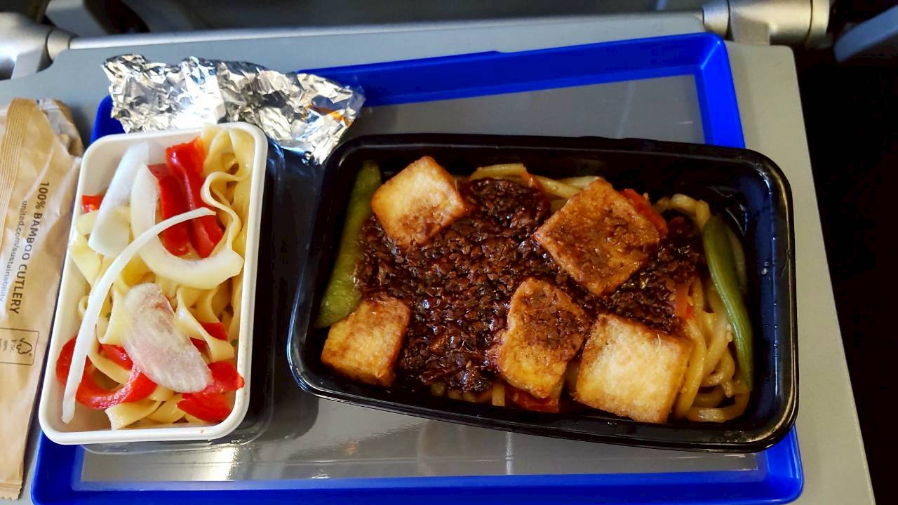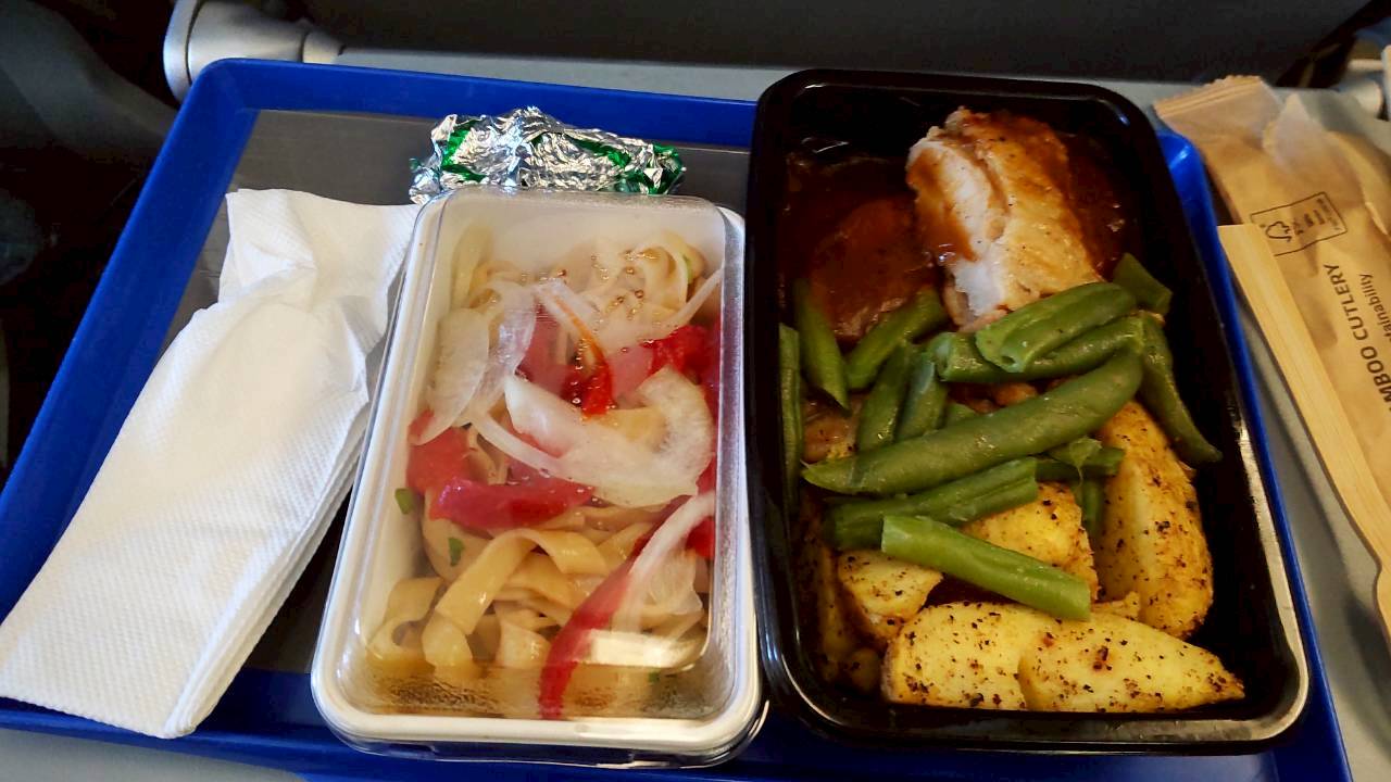 ユナイテッド航空機内食(上:チキン、下:パスタ)